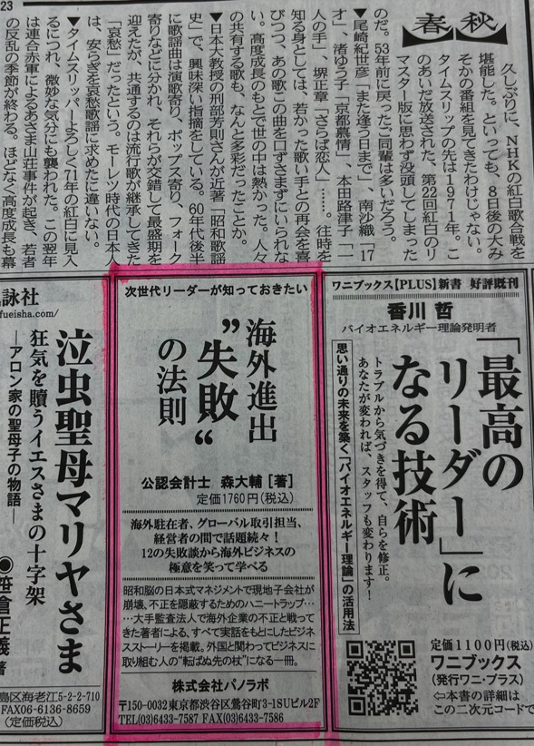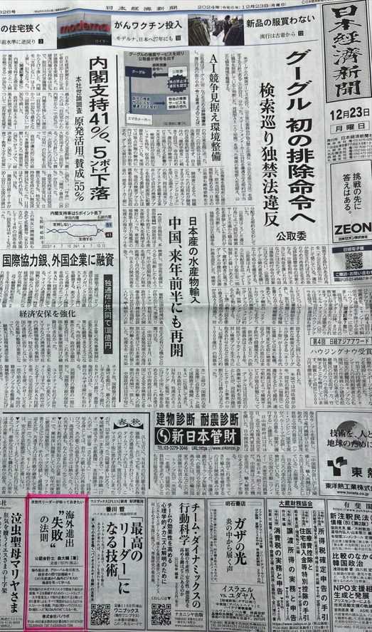 Today (23 December 2024), the Nihon Keizai Shimbun (Nikkei) published an advertisement in its morning edition regarding SMASH Group CEO Mori’s book, ‘Next Generation Leaders Need to Know: The Law of “Failure” in Overseas Business Expansion’.